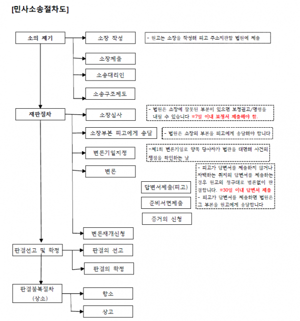 민사소송절차는 통상 원고의 소장 접수(제출), 법원의 소장 심사, 피고에게 소장 부본 송달, 피고의 답변서 제출, 쟁점정리기일, 변론준비절차, 변론, 판결 및 항소(판결 불복시) 로 진행됩니다.